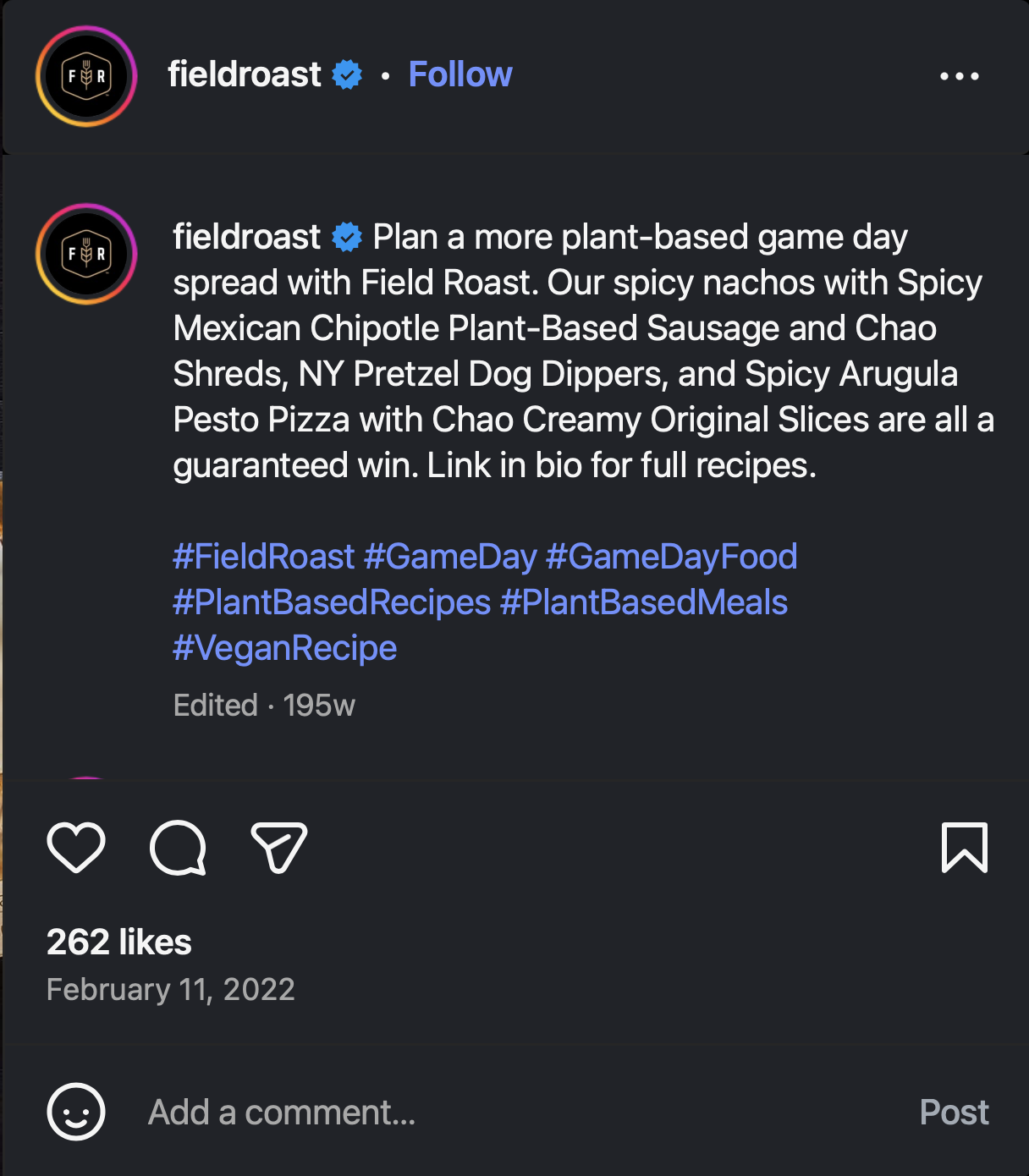 There’s no sports moment bigger than The Big Game. And nothing more synonymous with it than snacks! For our foodie audience, it was the perfect chance to shake up the snack table with dishes that felt daring, delicious, and different. Mouthwatering photography and easy, elevated recipes made Field Roast a standout on the most important Sunday of the Foodie Football calendar.